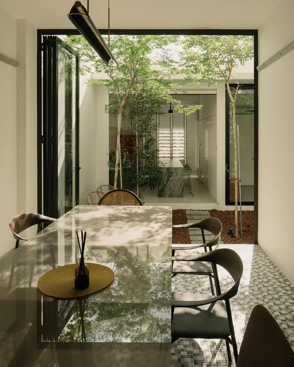 The couple were drawn to the dwelling for several reasons. It had a long, narrow plot which offered the possibility of inserting an internal courtyard. Both the front and back of the house looked out onto cul-de-sacs, which would satisfy their desire to create an open plan to connect to the fabric of the neighbourhood. Most of all, the house, which was built in 1957, exuded a period charm. And it was blessed with good bones. “We’re hopeless romantics when it comes to old structures,” Chaw explains. “Not in a nostalgic manner, but we recognise that a lot of intelligence was built into these old buildings, with the sort of craftsmanship that you don’t see these days.”