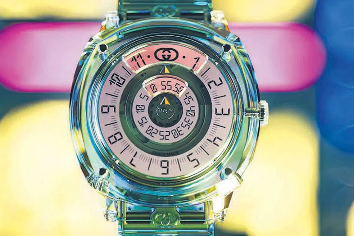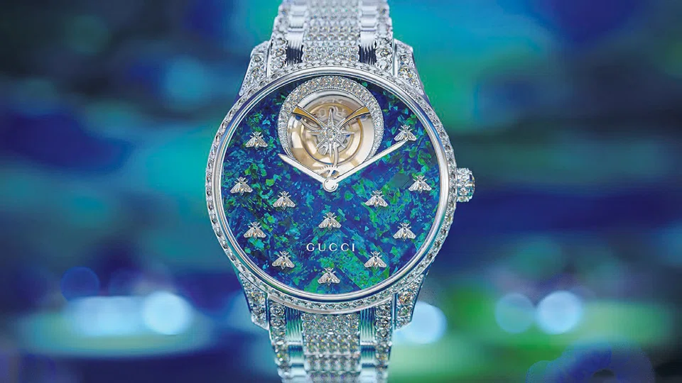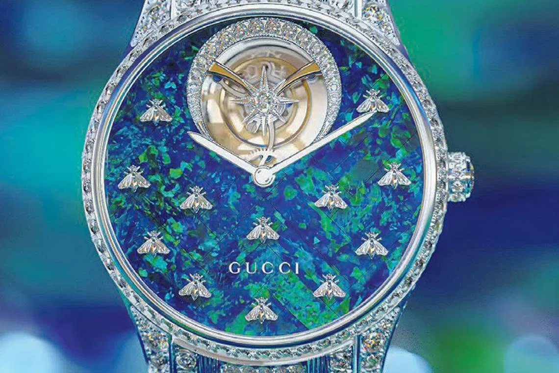 A new diamond set is added to this family, in tribute to the en tremblant style (a technique which creates movement in jewels when worn). The timepiece features 12 bees that shimmer around a dial decked with diamonds, as the wrist moves. The opal dial follows a miniature chevron pattern created from rectangular "bricks" formed by two rare opal varieties - pink and green. Each dial is unique because of the natural markings of the opals, while the mirrored caseback allows a personal message to be engraved. Each G-Timeless Dancing Bees marquetry edition is available in white and yellow gold bracelet, or in alligator straps variations.