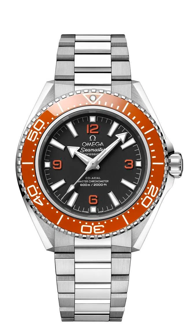 There are three orange models in the new Planet Ocean family, all crowned with a new orange ceramic bezel displaying a diving scale and featuring a matte black dial. The hours are marked by white strips complemented by varnished Arabic numerals 3, 6, 9 and 12 in orange.