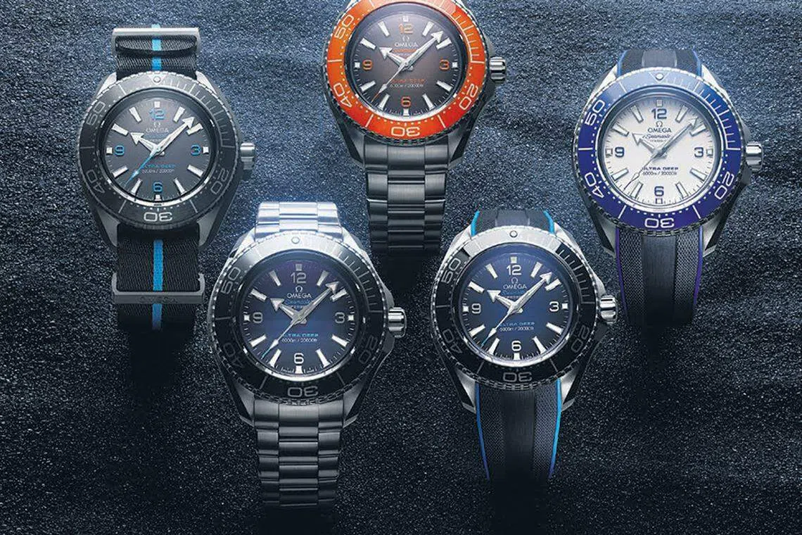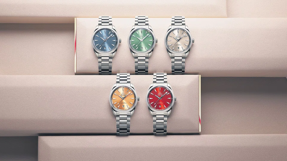 Pick from rainbow hues in the Seamaster and Speedmaster collections.