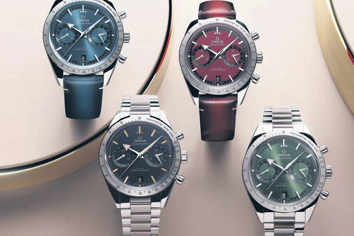 The other three models sport PVD dials in blue, green and a new varnished burgundy. The steel bracelets, fitted with Omega's patented comfort release adjustment system, are inspired by the Apollo 11 tribute timepiece introduced in 2019. Price: S$12,650 (bracelet), S$12,200 (leather strap).