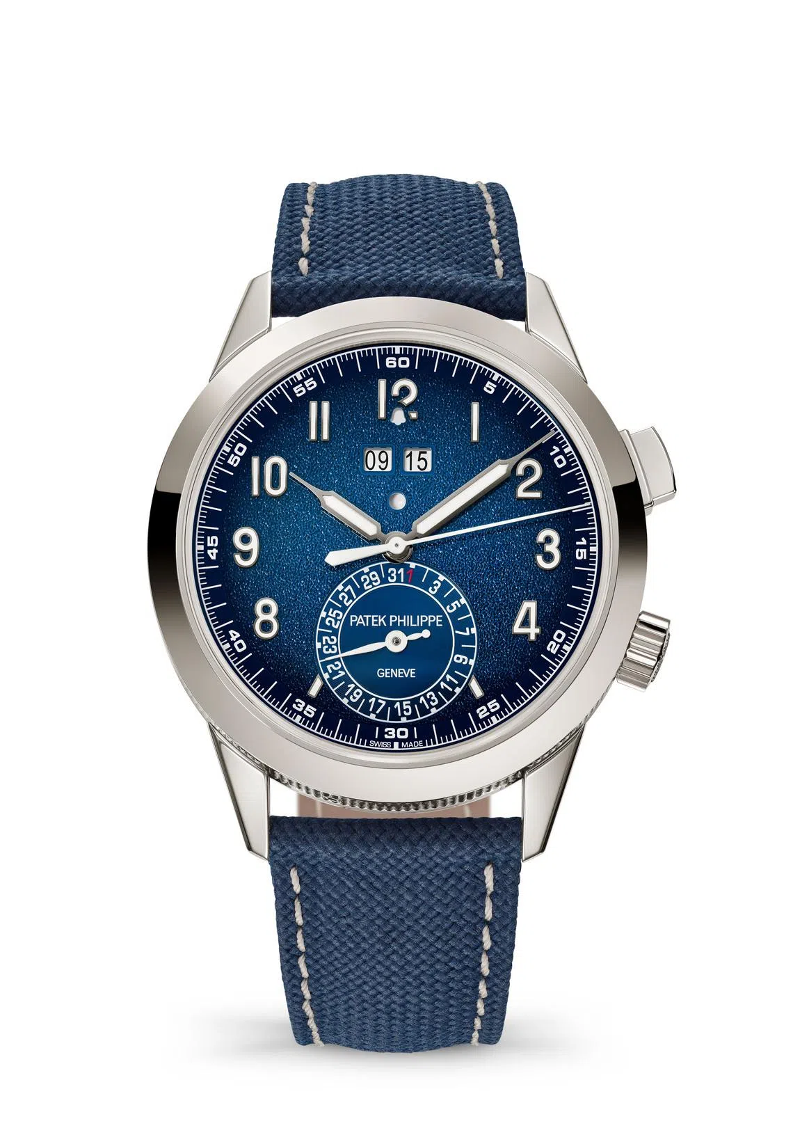The Calatrava Alarm is available in two interchangeable straps. The model with the blue dial features a navy blue composite strap; the green model has a green alligator leather strap. The second strap, for both watches, is in beige calfskin.