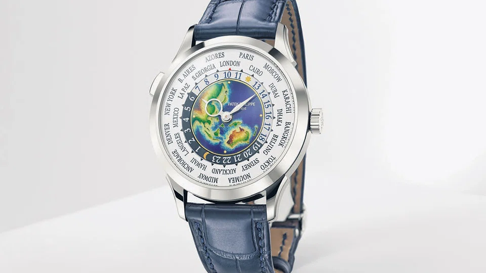 Grand Feu cloisonné enamel maps have often graced Patek Philippe's celebrated world time watches. The most recent one to receive this rare handcrafts treatment was the yellow gold 5231J-001 launched in 2019, which featured America, Europe and Africa. The white gold 5231G has a cloisonné enamel rendition of South-east Asia and Oceania. At the heart of the timepiece is a movement featuring a city disk and 24-hour disk with day/night zones. It shows the time at a glance in all 24 time zones at any given moment. To change time zones, simply press the pusher at 10 o'clock and all displays will be simultaneously corrected. The new world time watch, which replaces the previous yellow gold version, is paired with a matt navy blue alligator strap secured by a white gold fold-over clasp. Price: S$116,900.