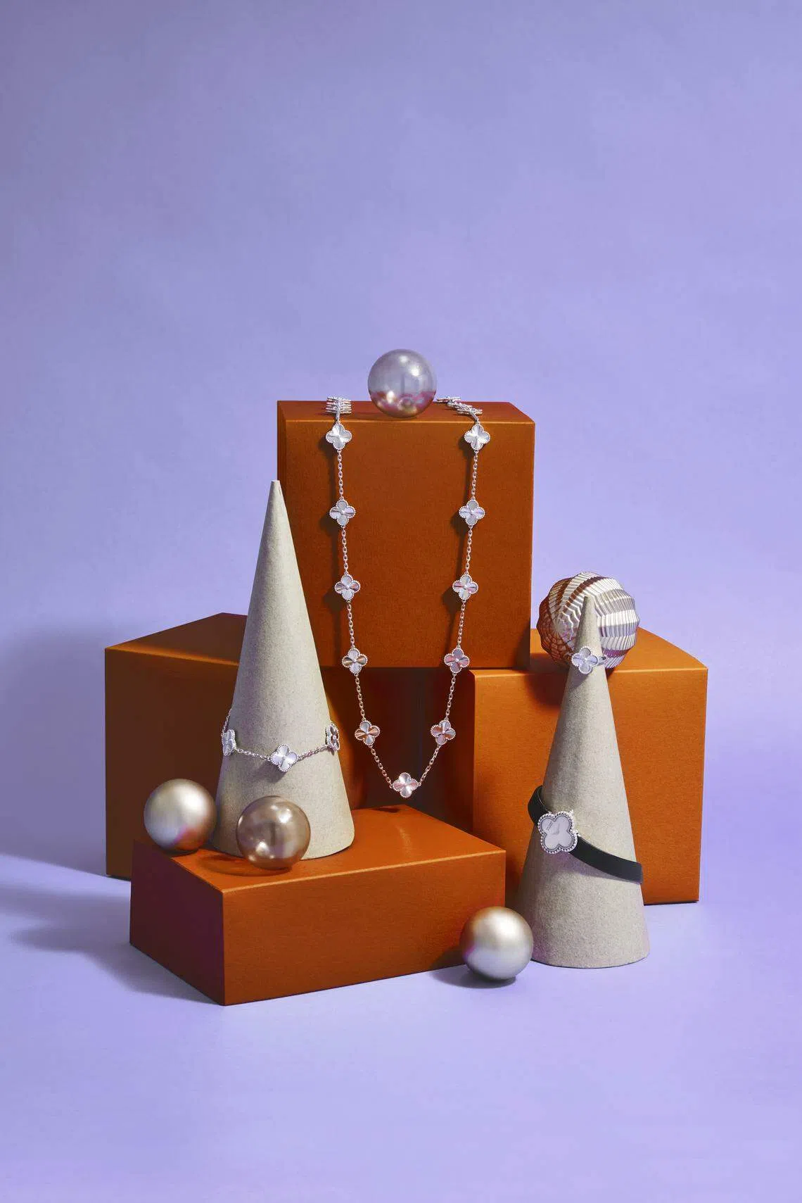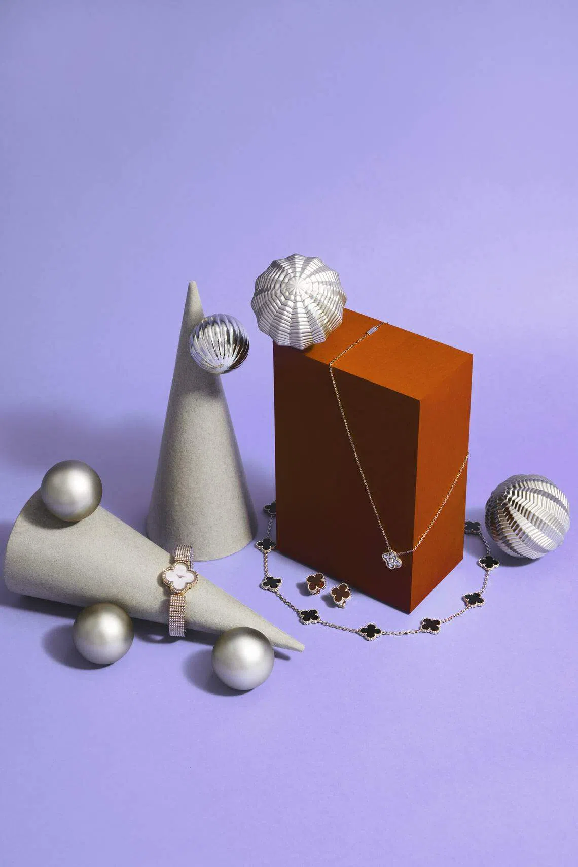 Clockwise from left: Vintage Alhambra 5-motif bracelet in guilloché white gold (S$8,750); Vintage Alhambra 20-motif necklace in guilloché white gold (S$35,000); Vintage Alhambra ring in guilloché white gold (S$5,800); Alhambra watch (small model) in white gold with mother-of-pearl dial, black satin and quartz movement (S$12,900) PHOTO: DARREN GABRIEL LEOW