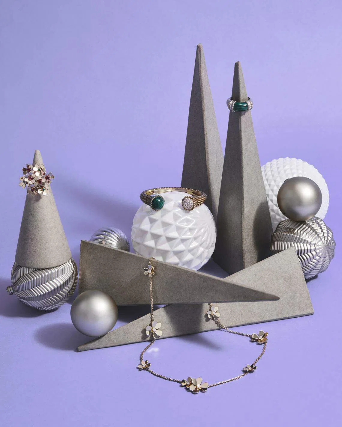 Clockwise from left: Frivole 8-flower ring in rose and yellow gold with rubies and emeralds (S$17,900); Perlée couleurs bracelet (small model) in yellow gold with malachite and diamonds (S$29,900); Perlée couleurs ring in yellow gold with malachite and diamonds (S$12,100); Frivole 9-flower necklace in yellow gold with diamonds (S$21,200) PHOTO: DARREN GABRIEL LEOW