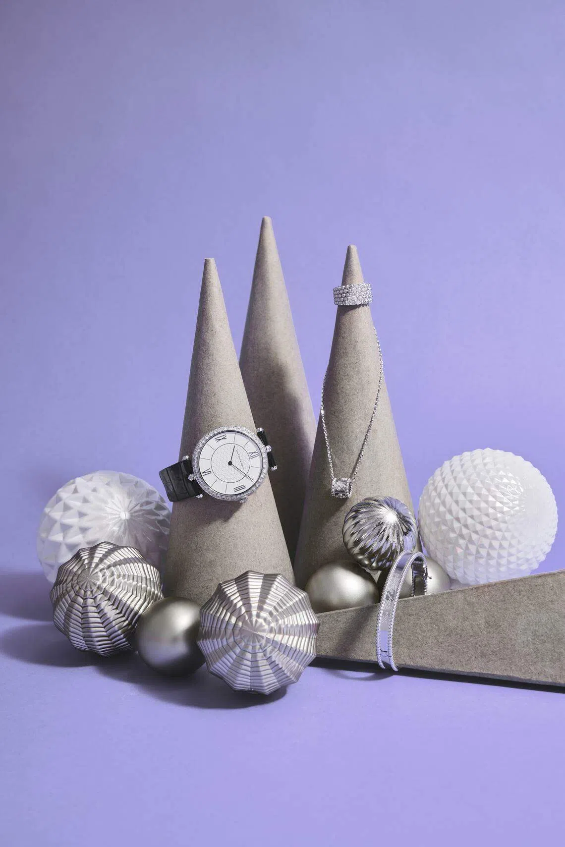Clockwise from left: Pierre Arpels watch in white gold with diamonds, lacquer dial, black alligator bracelet and manual-winding mechanical movement (S$52,000); Perlée diamonds 5-row ring in white gold with diamonds (S$16,700); Perlée clovers pendant in white gold with diamonds (S$7,600); Perlée signature bracelet (medium model) in white gold (S$10,500) PHOTO: DARREN GABRIEL LEOW