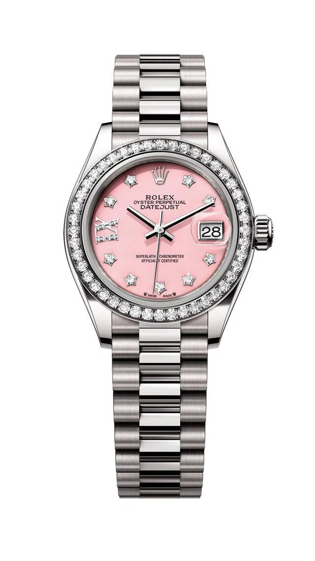 The dial is crafted from pink opal, embellished only with decorative gems that meet Rolex’s exacting aesthetic requirements. It features diamonds in 18 ct gold settings and a Roman IX in 18 ct gold, set with eight diamonds. The Lady-Datejust is available in a President bracelet in 18 ct white gold.