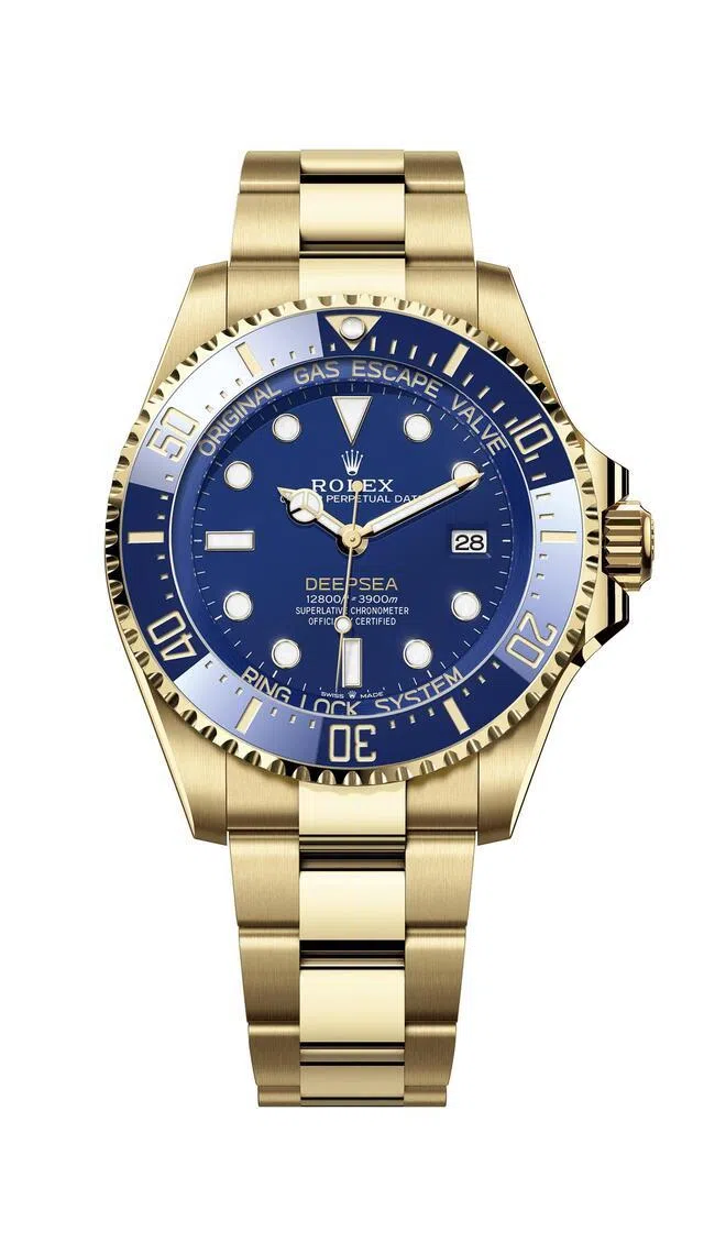 Unlike its Oystersteel counterparts, this chunky 44 mm ultra-deep diving watch goes even deeper, and comes in full 18 ct yellow gold, including the Oyster bracelet. But this is clearly a watch for divers.