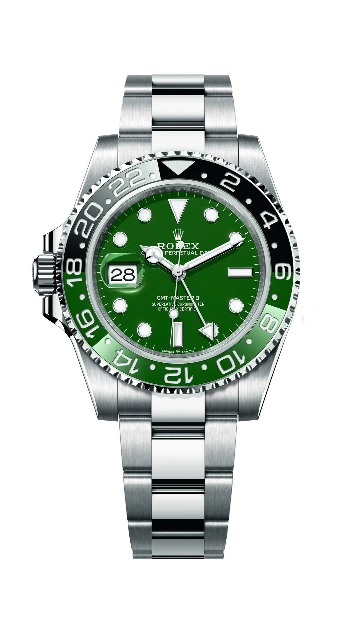 The iconic Oyster Perpetual GMT-Master II, a perennial favourite among travellers and watch aficionados, receives a striking makeover with the introduction of a green ceramic dial on an 18 ct white gold model. This bold choice of colour, perfectly complementing the green and black Cerachrom bezel insert, injects a contemporary energy into the classic design.