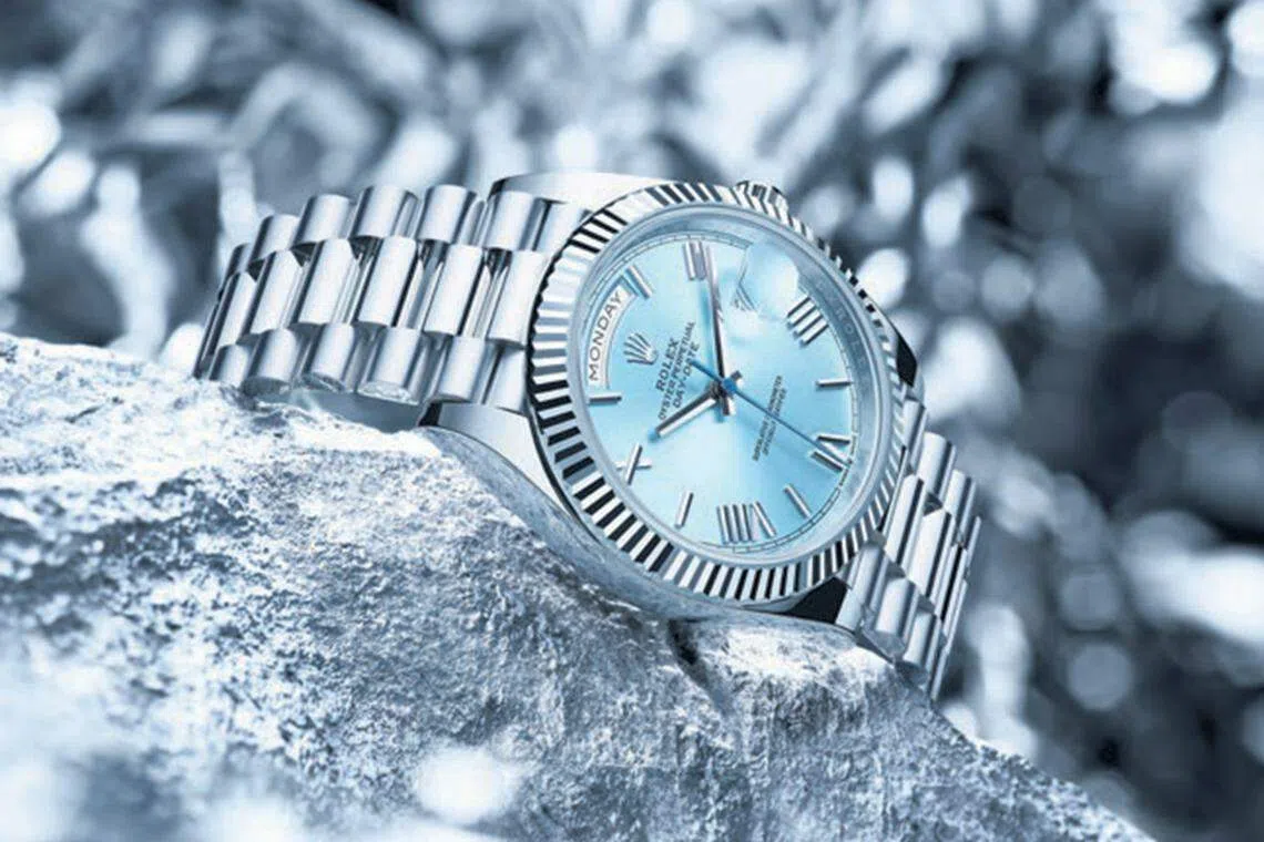 The only Rolex model to be cast exclusively from precious metals - yellow, white and Everose gold, or platinum. When the Day-Date was introduced in 1956, it was the world's first calendar timepiece to indicate the date and the day of the week spelt out in full in an arc-shaped window at 12 o'clock on the dial. As the ice-blue dial indicates, the new 40mm wide Day-Date watch is encased in the noblest material - the 950 platinum. And it features a fluted bezel, a first for the model. A key Rolex's aesthetic heritage, this striking component - found only on some of the brand's classic models - has until now been made in gold; in the new Day-Date watch it's in platinum. As platinum is challenging to work with, to have produced a fluted bezel with sparkling surfaces in this material was a technical feat.