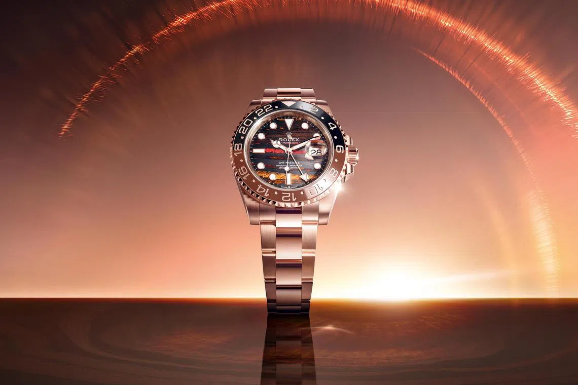 In turn, the cosmopolitan GMT-Master II, which has traversed the world on the wrist of many globetrotters, stands out with a new dial made of tiger iron. A natural stone with a fascinating hybrid appearance, tiger iron is a combination of tiger’s eye, red jasper and silvery hematite.