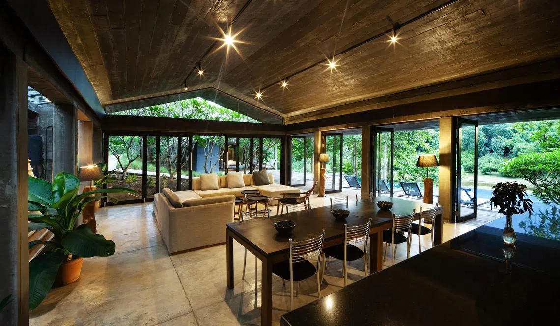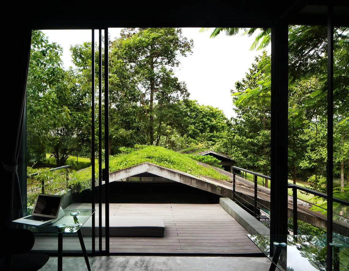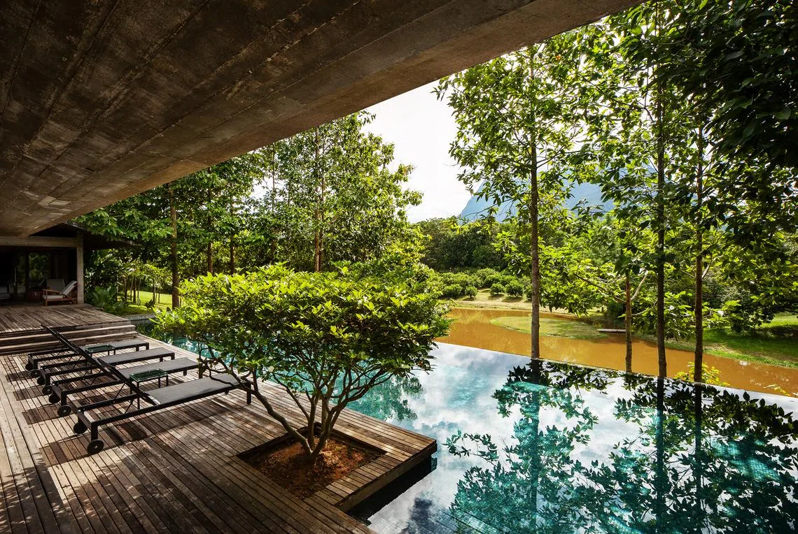 The cavernous quality is created with simple, pitched-roof architecture formed with bare off-form concrete. Decks made from local hardwood harmonise with dipterocarp tree trunks rising above the surrounding wilderness. Likewise, shallow planters in the roofs enable plants to grow and meld visually into the surroundings.