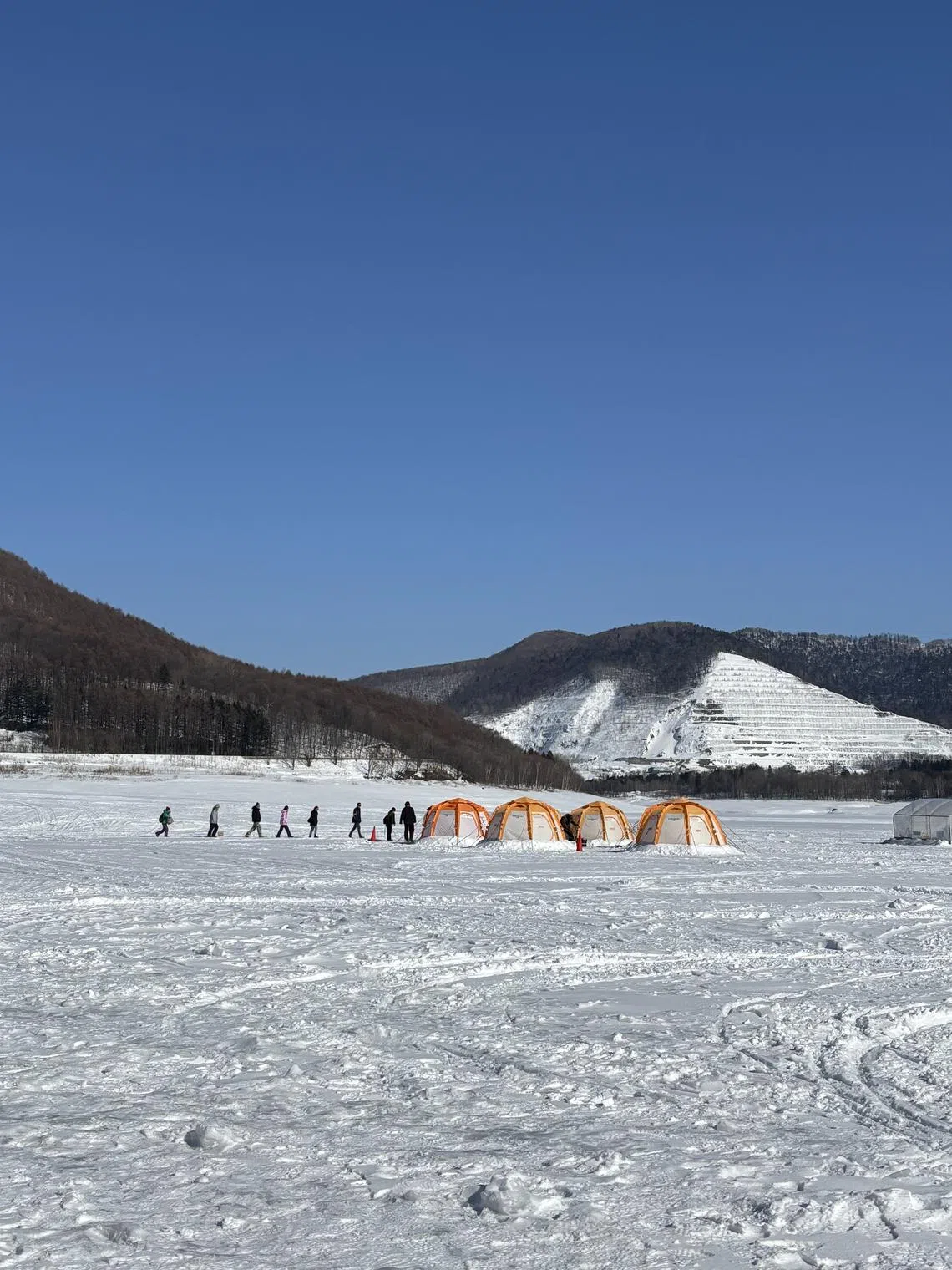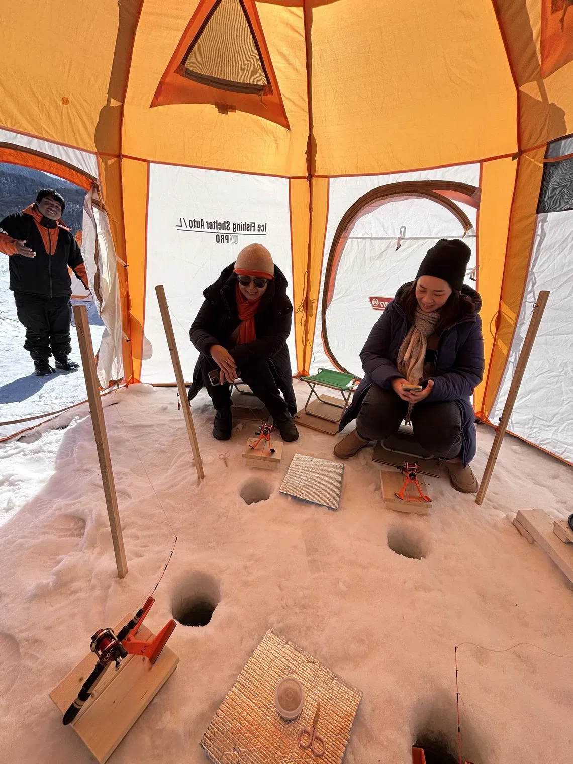 One morning, we head to Lake Kanayama for ice fishing – specifically for wakasagi, a species of smelt native to Hokkaido. Our guides lead us to the frozen lake and usher us into one of the heated tents. Seated on tiny stools, we lower our fishing lines through pre-drilled holes and patiently wait for a tug.