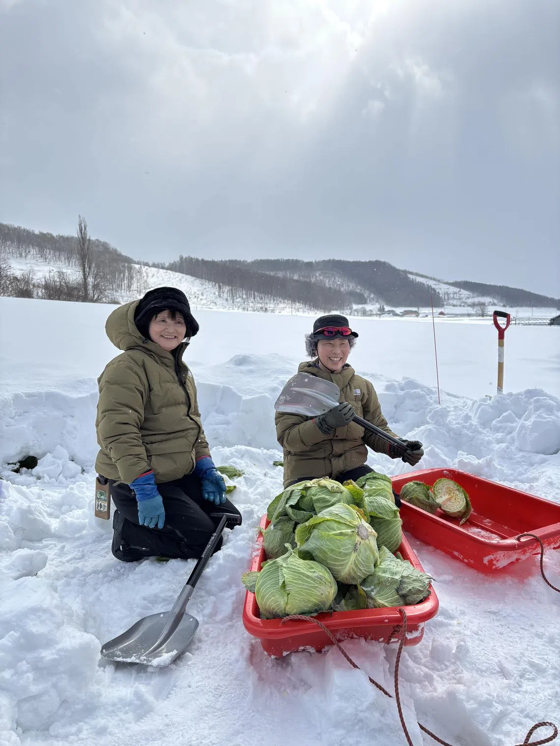 On another morning, we’re off to harvest cabbage. Part of Furano’s agricultural heritage, the leafy vegetables are buried beneath the snow to heighten their sweetness and preserve freshness. At the 100-year-old Endo farm, we’re given shovels to dig up the vegetables, which are then lugged to a tented area.