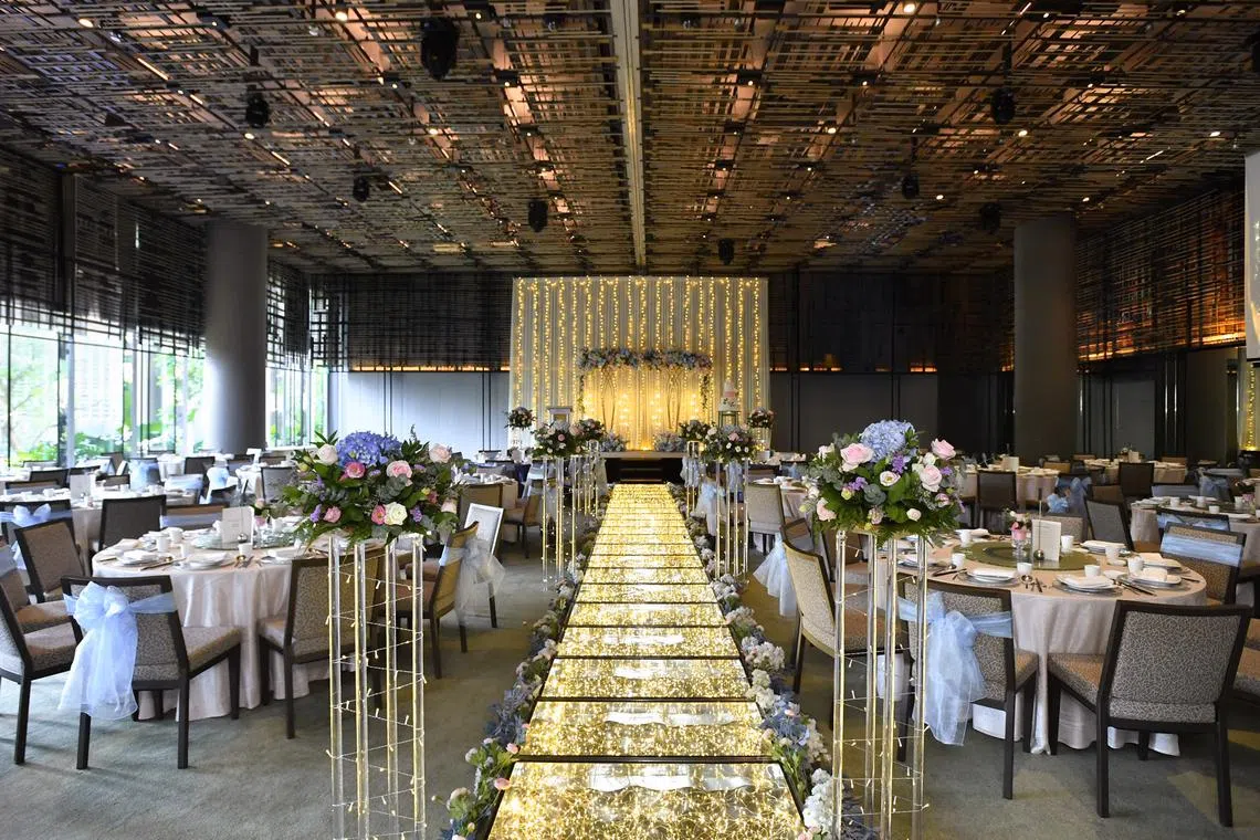 On the podium level, the William Pickering Ballroom looks out to Hong Lim Park and the surrounding skyscrapers, connecting the wedding ceremony with the city. The ballroom, which can accommodate up to 250 guests, allows light to stream in through floor-to-ceiling glass panels, adding flair as well as verdant views of nature to the wedding decor.