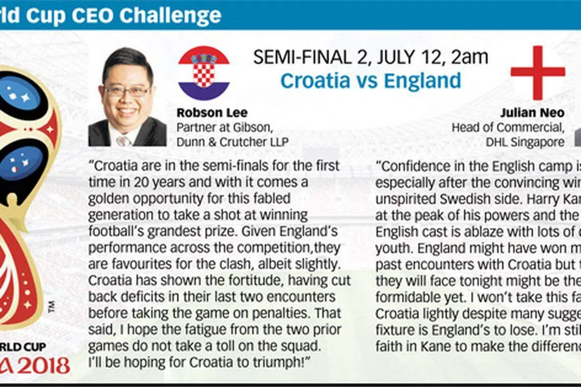 SUBSCRIBERSBT-World Cup CEO ChallengeShareAdd BT as a preferred sourceAdd BT as a preferred sourcePublished Tue, Jul 10, 2018 · 09:50 PMBT-World Cup CEO Challenge Copyright SPH Media. All rights reserved.Reuse this contentFeedback