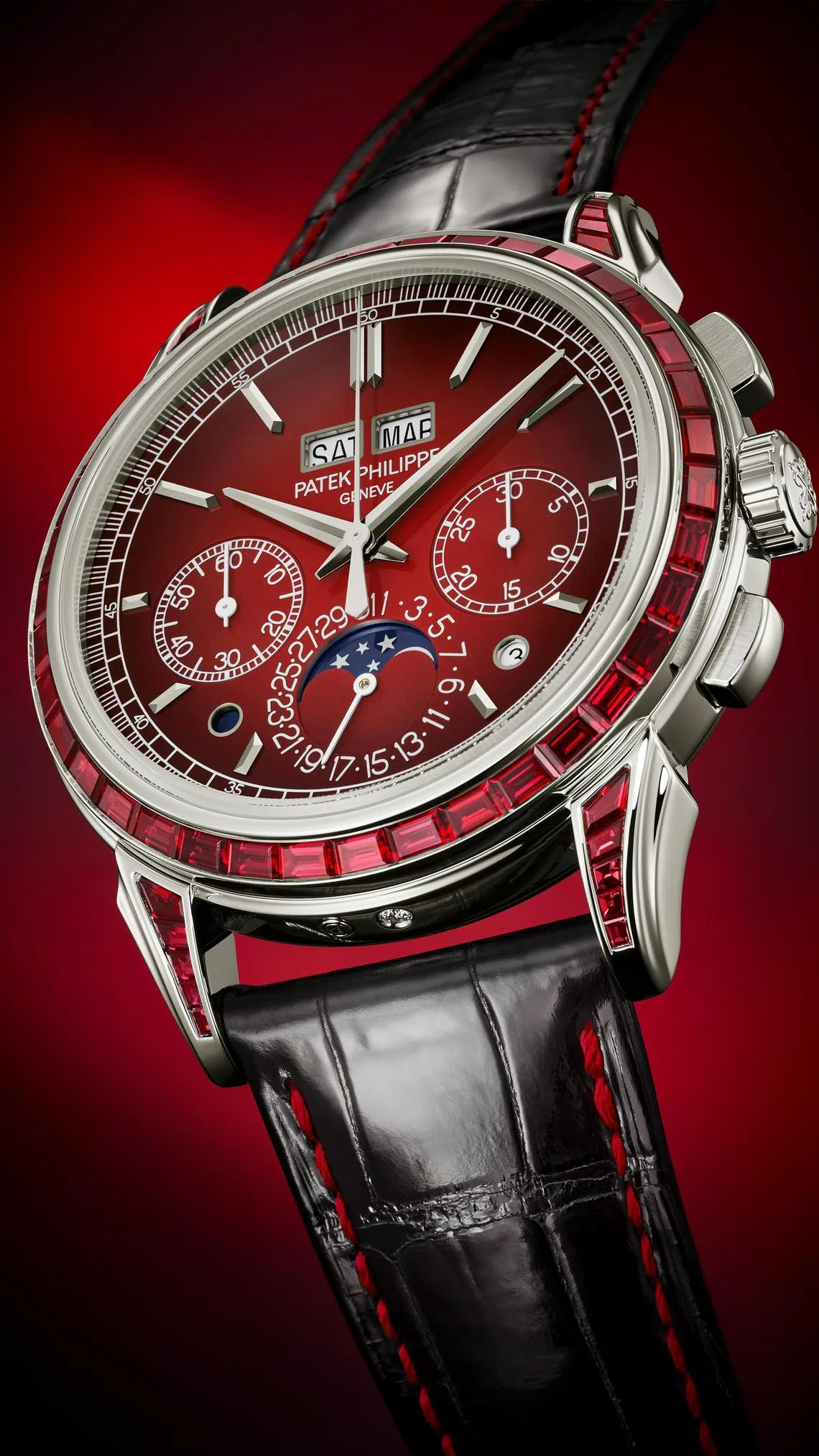 The red lacquer dial and 80 rubies that line the bezel and lugs are unlikely to deter them. The glow of rubies are more subtle than diamonds – and they are tempered by a black alligator strap, tastefully stitched in red thread and with a clasp set with red rubies.