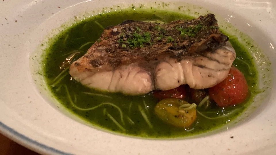 From the main courses, grilled barramundi (S$24) shines for its crisp, crackling blackened skin and moist flesh that sings from its clear, tangy basil-tomato broth.