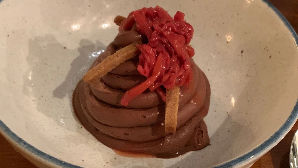 Desserts, on the other hand, are a perplexing lot. A straightforward eclair (S$14) is filled with a cassis custard cream which messes up our idea of what an eclair should taste like. The Valhorna chocolate mousse (S$12) is no better, with its swirl of mousse that falls short of attractive presentation, topped with cooked strawberries and damp, mushy gingerbread matchsticks that are a fine example of what gingerbread should never be.