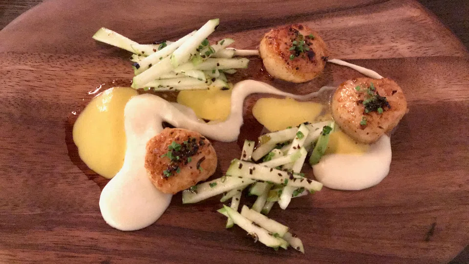 The mushroom soup is whipped into a cappuccino and served piping hot - standard but satisfying. As far as seafood goes, don't expect great quality but the chef (a Les Amis alumnus) pulls ingredients together competently. Pan-seared scallops (S$19) are average in quality but get a lift from a crisp green apple salad, cauliflower puree and a kind of apple sauce-olive oil emulsion.