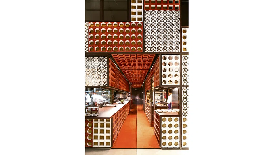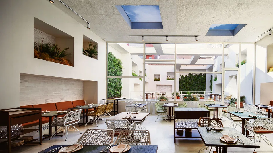 Enter the modest entrance of Disfrutar - Spanish for 'enjoy' - in the Eixample district and you are led into a Mediterranean wonderland that gets bigger and deeper the further you walk in. It's a giddy, colourful playground decorated with ceramic tiles that are on the one hand a nod to the artist Joan Miro and on the other, a tribute to the clay ovens and cooking vessels of old. You are led past the bar and the immense kitchen where the chefs are visible from wherever you sit, and into the white, brightly lit dining room inspired by fishing villages. You end your meal in the outdoor terrace, sipping coffee and nibbling cotton candy plucked off a cotton 'tree'.