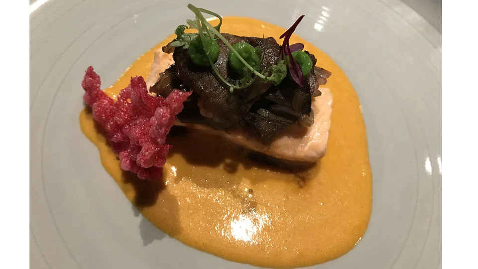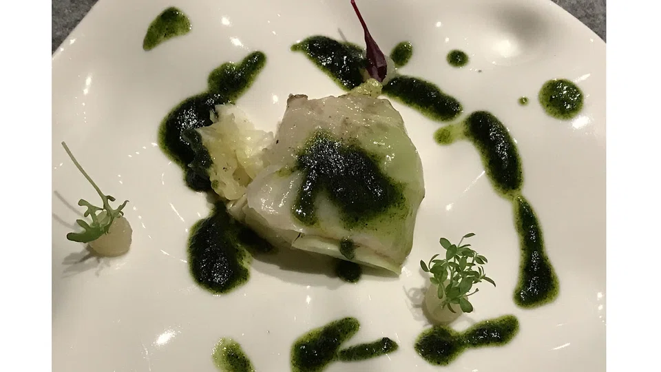 If you were a cabbage, you'd want to be in Chef Lerouy's shopping basket because he treats his vegetables the way chefs treat their prized wagyu. Why he takes so much trouble is an example of his philosophy that you don't need expensive ingredients to create fine cuisine. Here, he cooks the cabbage in a salt dough crust. It's brought to you still in its bread-like case, sliced open to reveal tender leaves which are immediately covered with thin slices of lardo and torched to create a layer of richness. The cabbage is plated and parsley sauce drizzled around it, decorated with dots of sour lemon conserve and egg yolk cream for extra depth. It's a lot of trouble for a humble vegetable, but the result is worth it.