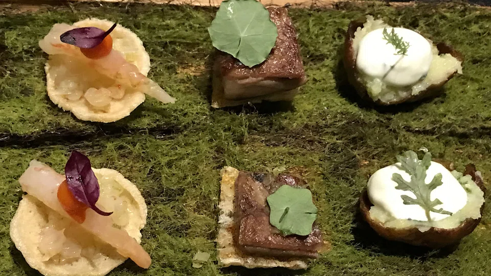 A single loaf of bread sits forlornly in a rather small see-through oven, so we know our names are on it. And so it is when its crusty, spongy self appears sliced and hot in a little cloth bag to keep it warm. Before long, three kinds of tapas arrive - a fish cracker (keropok) is topped with chopped raw and whole shrimp; a crispy skinned cold potato covered with smoked eel and tart creme fraiche; and lamb belly sitting on crispy pork crackling.