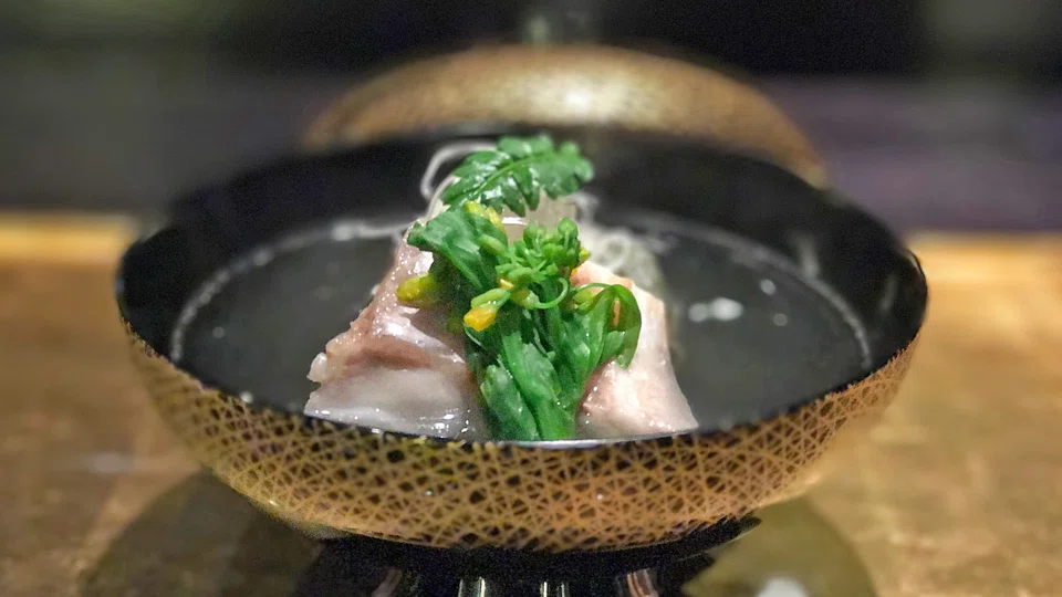 A clear soup is served in an arty black and gold bowl, its shimmering surface interrupted by a thick chunk of kue fish - a long-toothed giant grouper. The meaty fish makes space for a green square of "fu" or Japanese wheat gluten, which hasn't got much taste and is a little lost on us.