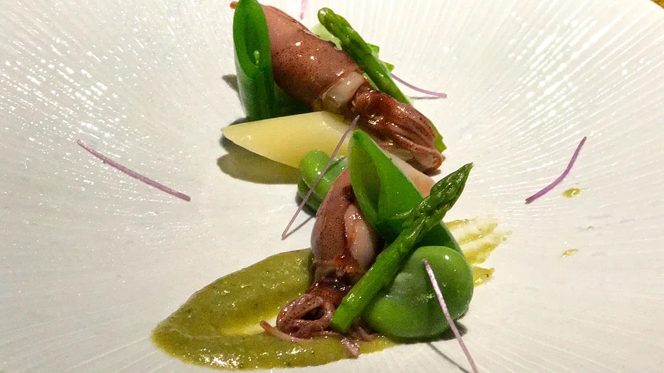 A sweet sansho miso sauce picks up and enhances the brininess of the squid to good effect.