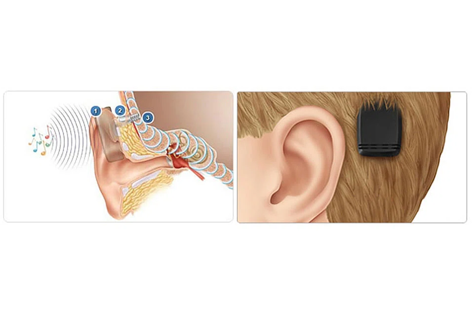 Hearing aids that attach to the side of the head onto the skull are also very helpful (Figure 3, Bone-Anchored Hearing Aids, BAHA). They transmit sound waves by vibrating the skull and thereafter transmitting the energy to the inner ear.