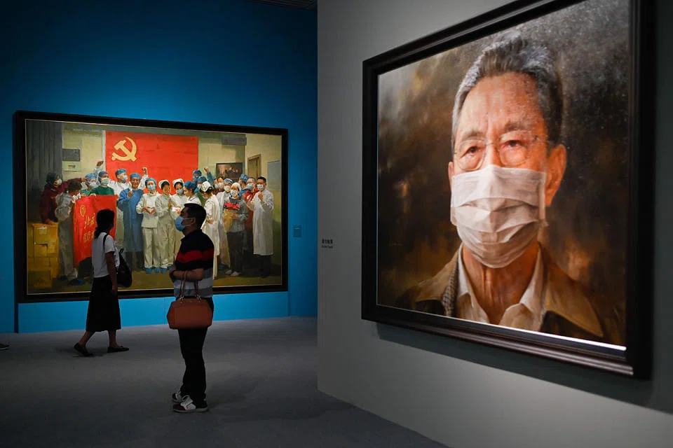 The National Museum of China's "Unity of Strength" showcases paintings, sculptures and calligraphy, all faithful to the socialist realism style, that depict what the regime says is its success in responding to the crisis.
