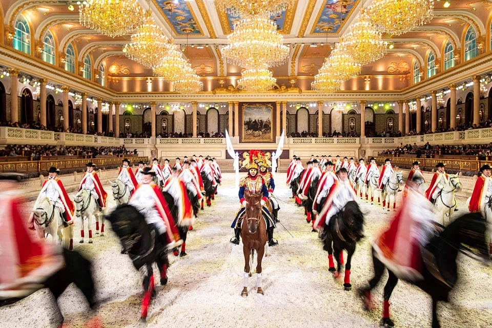 Once a week, pristine horses are paraded and perform crowd-pleasing tricks in an opulent arena designed in what the official website calls "Austro-Hungarian Empire style". A giant portrait of Napoleon on horseback overlooks the performance.