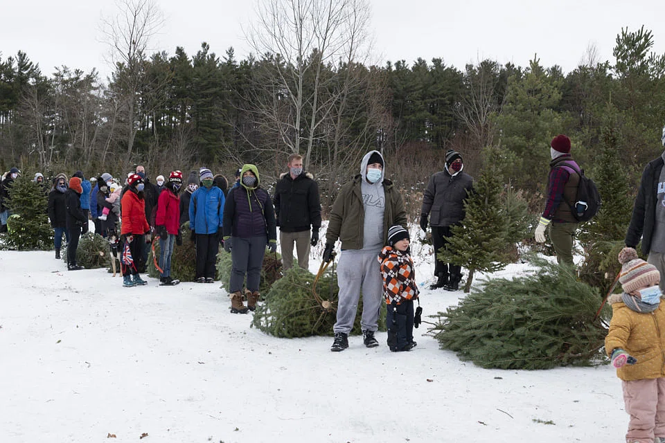 "We're all stuck inside," said John Grogan, a 67-year-old retired electrician, standing in a long line of families waiting to board a wagon and be towed out into the Christmas tree fields. "Everybody needs something to cheer them up. This is the way to do it."
