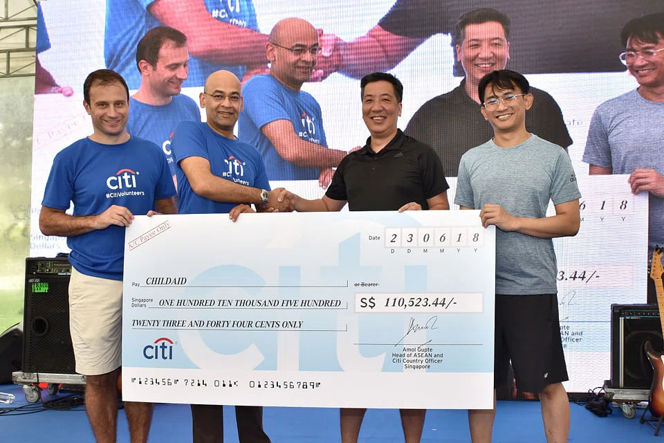 Adam Proctor, global market manager, Singapore, Australia and New Zealand, Citi Private Bank and Amol Gupte, Asean Head and Citi Country Officer for Singapore, handed the cheque to ChildAid co-organising chairmen, BT arts correspondent Helmi Yusof and ST news editor Marc Lim, during a Citi Global Community Day (GCD) event on Saturday.