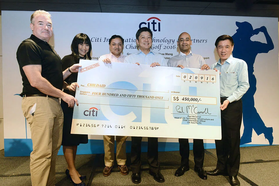 The sum was raised through donations from Citi's partners for a charity golf event and will benefit ChildAid, a charity concert in aid of The Straits Times School Pocket Money Fund (STSPMF) and The Business Times Budding Artists Fund (BT BAF).
