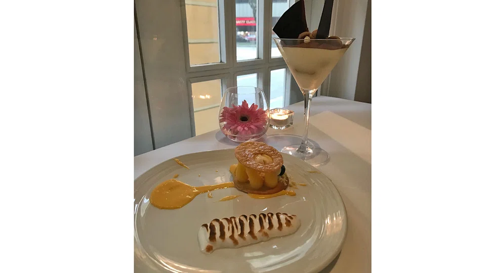 Chef Huang could go a little easier on the salt, especially in the otherwise beautifully-executed pan-fried red snapper with seasonal vegetables (S$32). Cooked with the scales on, Japanese-style, the fillet of milky-fleshed fish is covered by a crackling crisp armour and paired with pea puree and a poised array of cooked vegetables. The satisfying crunch of crust on soft flesh would have gone down better with better control of the salt shaker.