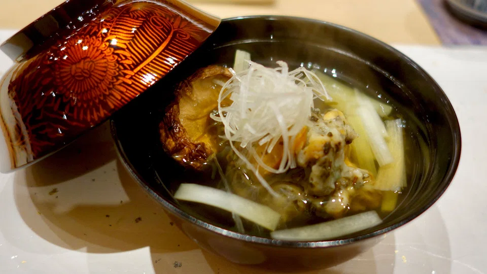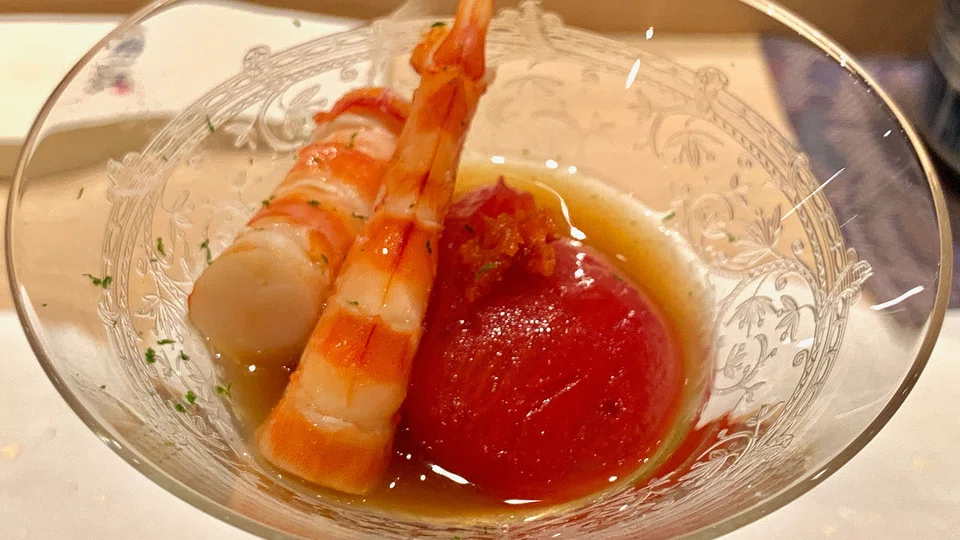 The price of a ticket is S$250 - not cheap, but not overpriced. And you get to taste how those years have culminated in a unique style of cuisine that is clean on the palate, but belies the complexity of the preparation. A prawn and tomato cocktail? Sounds easy enough until the tomato explodes in your mouth. It's not just ripe and sweet - the conditions for Japanese citizenship. There's more to it, an umami that comes from being soaked in kombu dashi and a hint of vinegar. Then there's the broth - a cold consomme of kuruma ebi, aka intense shrimp stock with all the flavour and none of the "prawniness". And of course, the ebi - firm, meaty and topped with a dab of yuzu chilli paste.