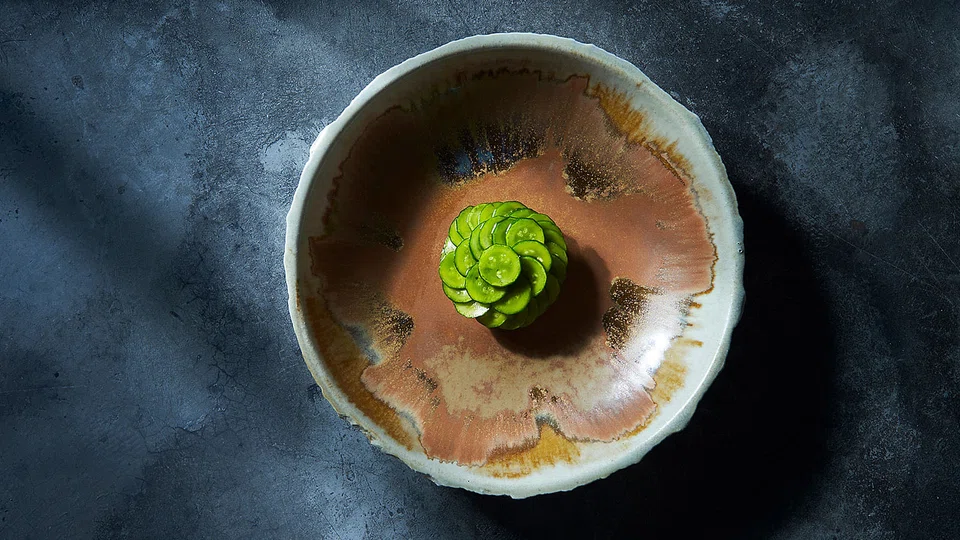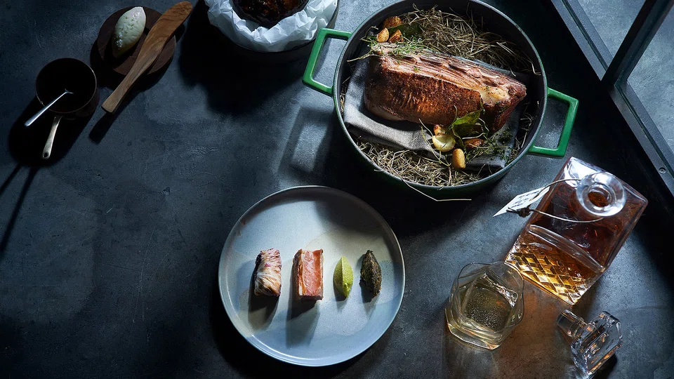 From his Sri Lankan playbook is curried millet that keeps its shape and texture without lapsing into mushiness, with crunchy popped grains for good measure. They're a cosy bed for sweet Australian marron, cooked over binchotan with multiple brushes of butter made from the marron coral. The binchotan is the chef's good friend - its smoke-free slow burning embers gently cooking bouncy-fleshed French turbot that's been cured with salt and sugar to drain its excess water, dressed in a rich buttery sauce of black garlic and stock from turbot bones. Parsley puree and dehydrated leaves of Cavolo Nero dusted with nori powder make this dish your edible BFF.