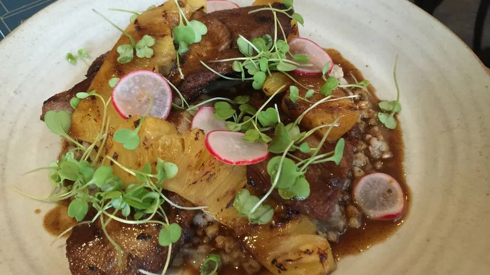 While our warm flatbread gets steadily cold while retaining some of its chewy bite, the pan-fried crisp barramundi (S$26) gets our attention for its nicely seared edges and the savoury, slightly citrusy broth it sits in, with lots of green vegetables to round off this healthy entree.