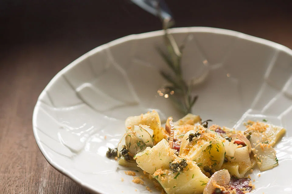 The less-is-more principle extends to the home-made pappardelle - fat sheets of al dente pasta that has a spring in every bite, so simply dressed in olive oil infused with rosemary, bits of crispy pork jowl bacon, or guanciale, and a sprinkle of toasted bread crumbs. The Aussie-Italian puts his heritage to good use here in this uncomplicated treat.