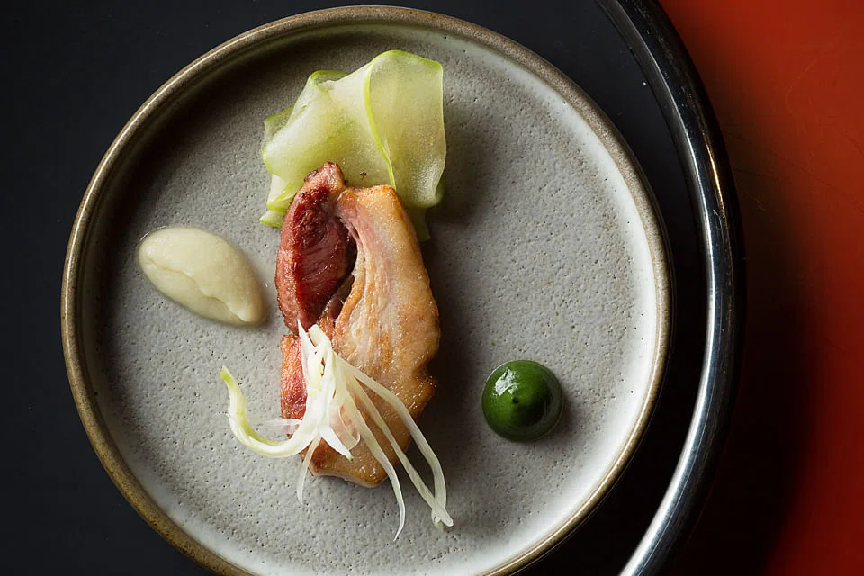 Speaking of animal odd bits, pork jowl is cooked sous vide and served wobbly and quivering in its own fat - pull-apart tender with basil and kohlrabi purée, the richness countered by pickled shaved kohlrabi. But we find more flavour in the steak-like slices of smoked and sous vide wagyu knuckle, with its fleeting aroma and tender, gelatinous texture. The creamy polenta it sits on hasn't got that baby food texture to it - a pleasant graininess makes you thankful for your ability to chew. And the cheesy wasabi butter on top nails it.