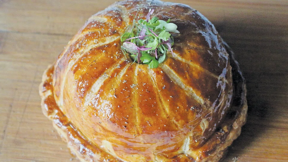 1 Peel and slice potatoes with a Japanese mandolin, rinse in water, pat dry with a cloth. 2 Put potatoes in a pot with peeled garlic, thyme, and season with salt and pepper. Cover with the cream, cook slowly over low heat till potatoes just begin to get cooked (about 15min). 3 Strain. Reduce cooking liquid by half over heat. 4 Mould the cooked potatoes into an 18cm stainless steel ring, alternating with pancetta and tarragon. 5 Refrigerate to cool. 6 Place the first layer of puff pastry on a lined baking tray. Place the layered potatoes onto it. Cover with the second puff pastry disc and make a small 'cheminee' or vent, to let the steam escape. "I cut a small circle of pastry from the middle and insert a little chimney made of aluminium foil just like I've watched my mother do it," says Chef Royer. 7 Brush the pate all over twice with egg wash. 8 Bake for 5min at 200°C then, for 15min at 180°C on a hot tray. 9 Let the pate rest for 10min. 10 Serve with a mesclun salad of fresh herbs with a red wine vinaigrette.