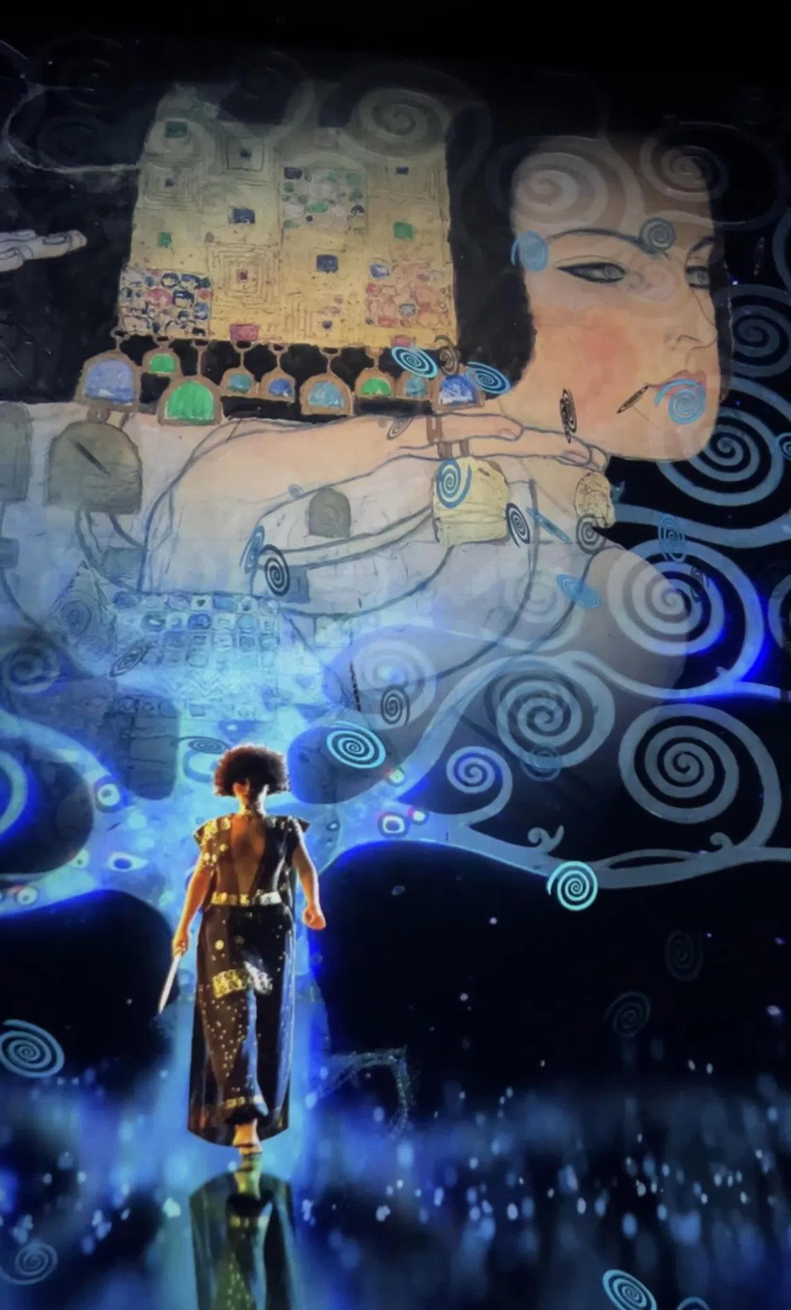 But where the show triumphs is in its immersive technology: A large room envelopes you in an ever-changing kaleidoscope of shimmering colours and images. Characters in his paintings come alive as Amazonian figures staring down at you. His famous painting Tree Of Life is rendered here as a life-size object with swirling leaves and golden branches.