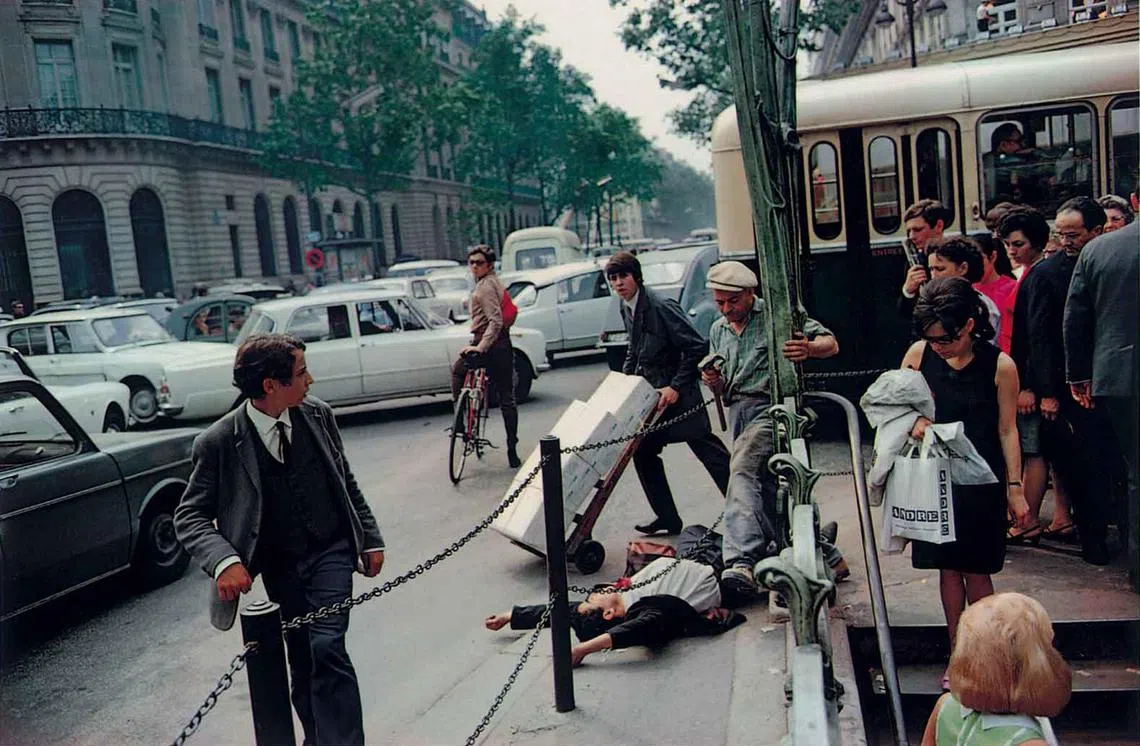 The exhibition includes his most iconic snapshots, including Fallen Man, Paris (1967). Here, a man lying unconscious on a Parisian sidewalk draws only curiosity and indifference from passers-by – instead of help and concern. The image, like much of Meyerowitz’s street photography, offers a profound commentary on urban isolation and the detachment of city living.