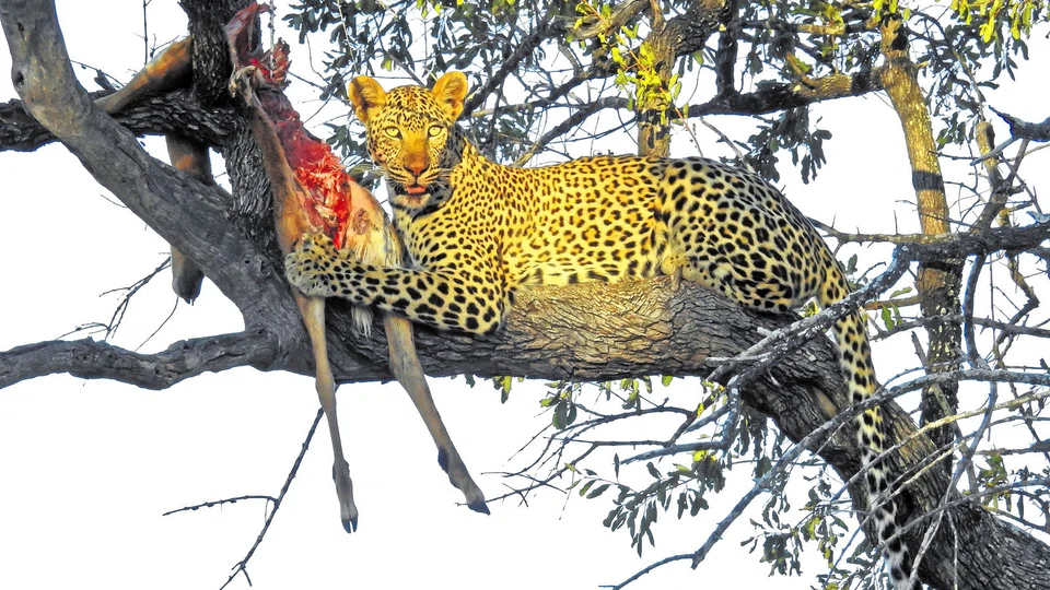 So intent are they at this mating game that one of them is totally oblivious to the female leopard in a tree above him, leisurely dining on one of his brethren, draped over a branch with legs and head hanging like the handiwork of a messy butcher.
