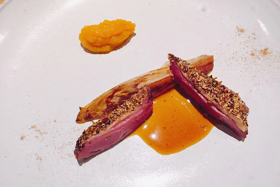The eight-course menu featured Sato's signature dishes such as poached oyster wrapped with wagyu, and roasted pigeon with aged mandarin skin and spices. Brehm presented four new dishes including a uni, buckwheat and chocolate pasta and glazed, lightly smoked yellowtail kingfish on top of crispy rice cake.