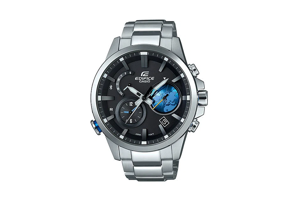 Many of the smartwatches in the market ignore the elements of the watch, preferring to focus on the connected features instead. The Casio Edifice EQB-600D is an analog timepiece that can be paired with a smartphone. When connected to the Casio Watch+ app, it connects to the company's Accurate Time System to match with the company's supplied time data, to provide accurate times for 300 cities globally. The watch also has a multidimensional 3D Globe Dial that has a detailed Earth motif. The curved inset dial around the dome-shaped motif indicates the time zone, and gradually rotates every 24 hours.