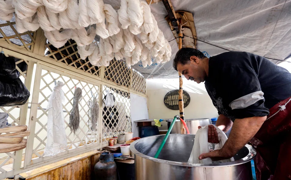 Shielded from the sun by a light tarpaulin sheet, he and his 15-year-old son, Nour, stand on either side of a large cauldron in their boots.
