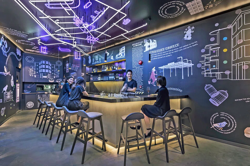 Black and neon lights form the main colour scheme in COO Bistro. The windowless space with steel mesh and blackboards as walls gives it an on-trend, detention class feel, as if many a recalcitrant student had spent hours here writing the equivalent of "I must make this place look cool" on the board. All the bistro walls are covered with whimsical chalk sketches of bird cages, old flats and dim sum, right down to the history of Tiong Bahru's flats. Yes, the retro-cool vibe is strong in this one, hammering the point home from the decor to the menu of "glocal" cuisine.