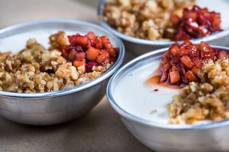 Dessert of "Tiong Bahru Chwee Kueh" (S$9) is misspelled as "kuey" in the menu, but maybe that's because there's something lost in the translation of this cute but blah panna cotta served in a little metal plate topped with a granola-like mixture of candied walnuts and balsamic strawberries. We'd rather bypass this twee interpretation of the savoury snack for the conventional but delicious crisp waffles (S$13) groaning under the weight of ice cream and grilled, slurpily soft bananas.